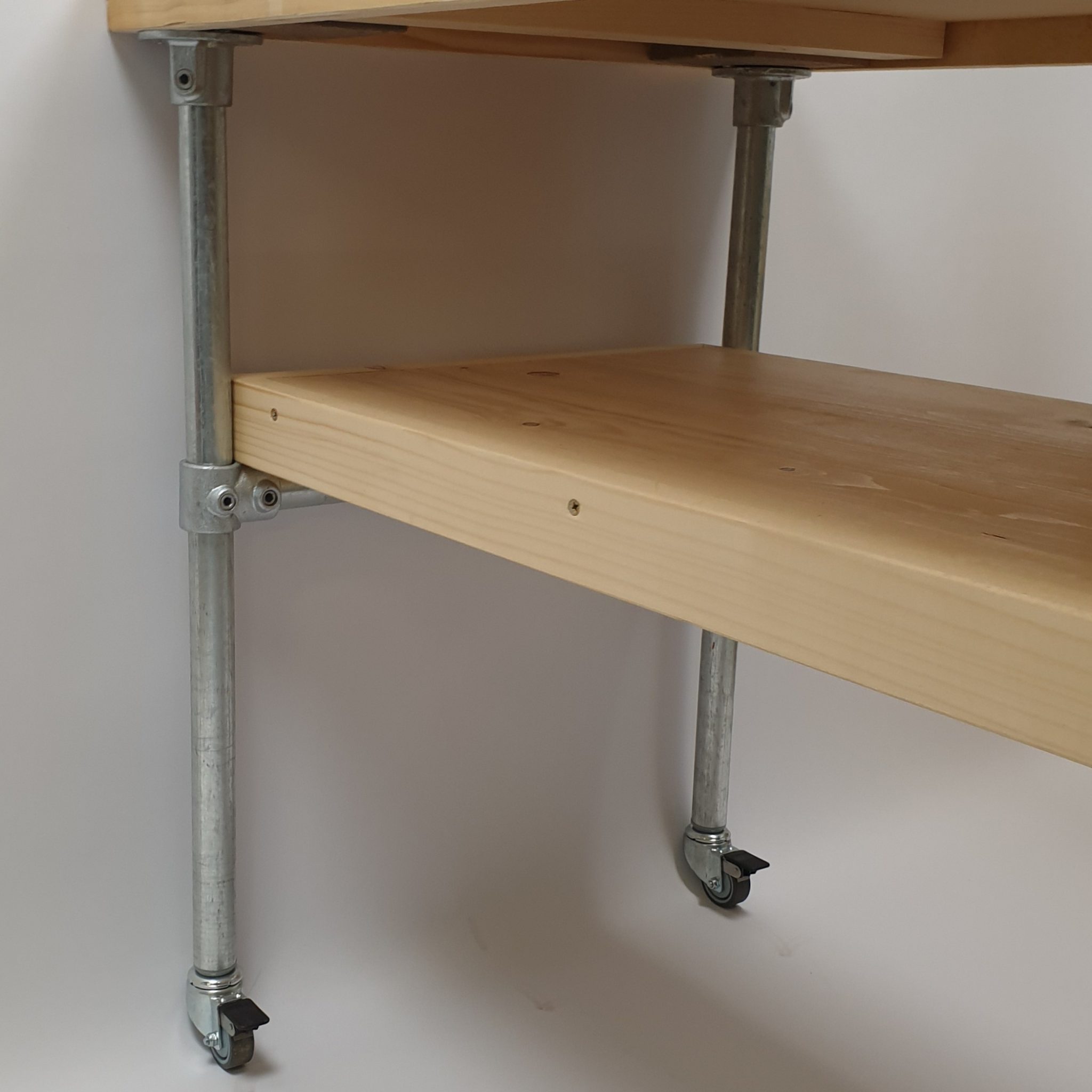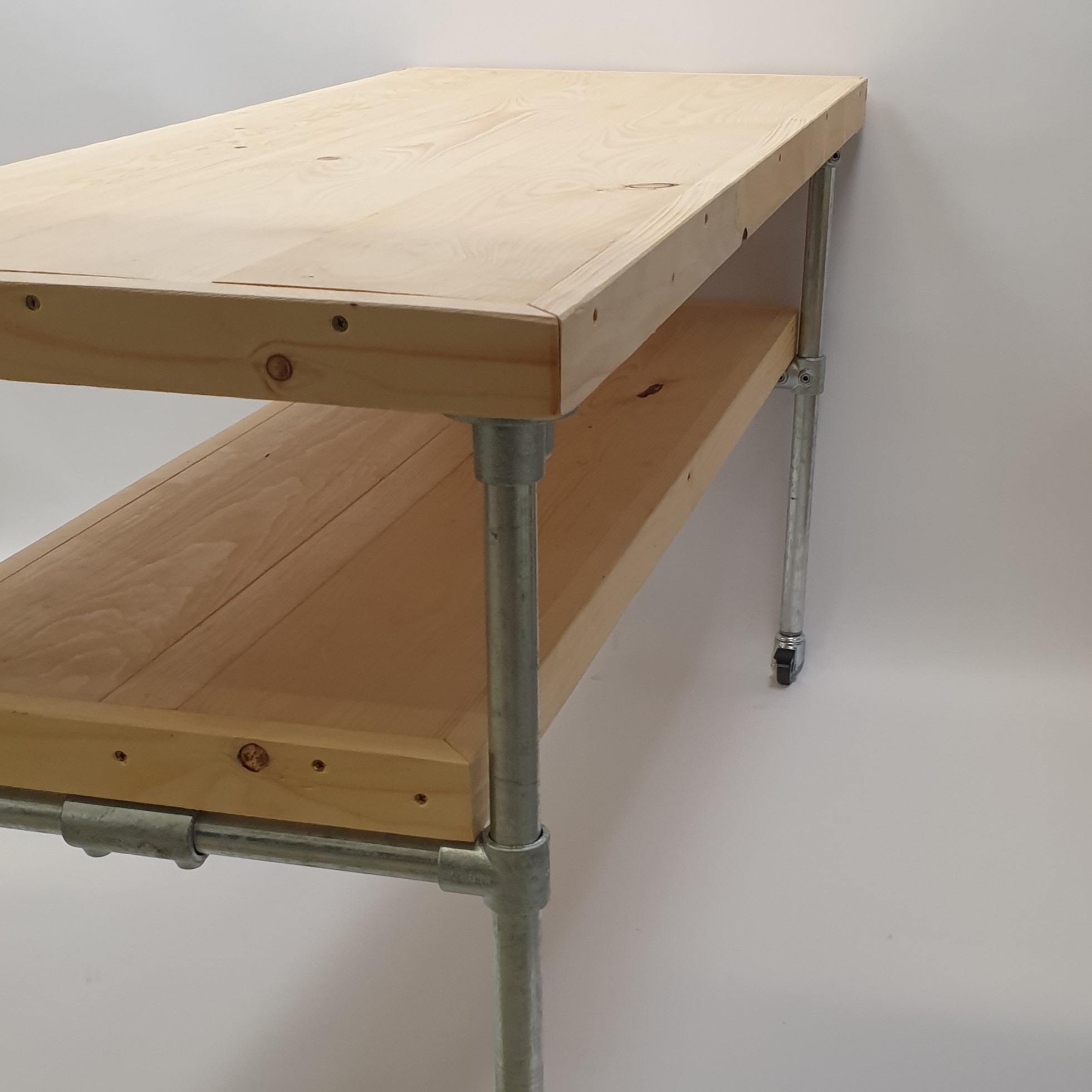 Tafel van steigerbuis (33,7mm) en een blad van vurenhout gelakt, zowel onder als boven. Word vooraf in elkaar gezet en in zijn geheel geleverd!